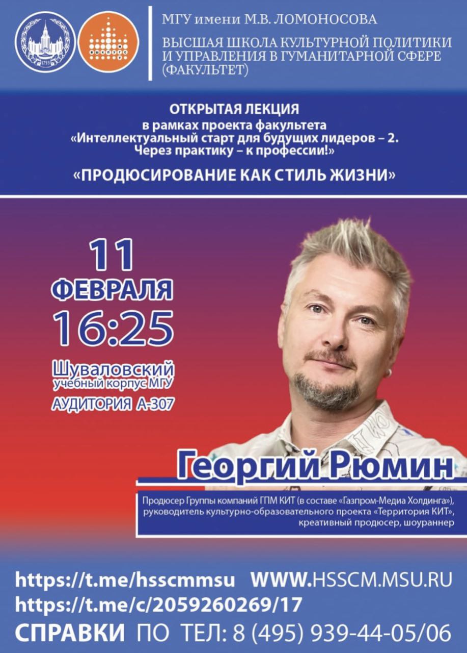 11 февраля в рамках нашего проекта вас ждёт открытая лекция «Продюсирование как стиль жизни», которую проведет Георгий Рюмин - продюсер Группы компаний ГПМ КИТ (в составе «Газпром-Медиа Холдинга»), руководитель культурно-образовательного проекта «Территория КИТ», креативный продюсер, шоураннер.